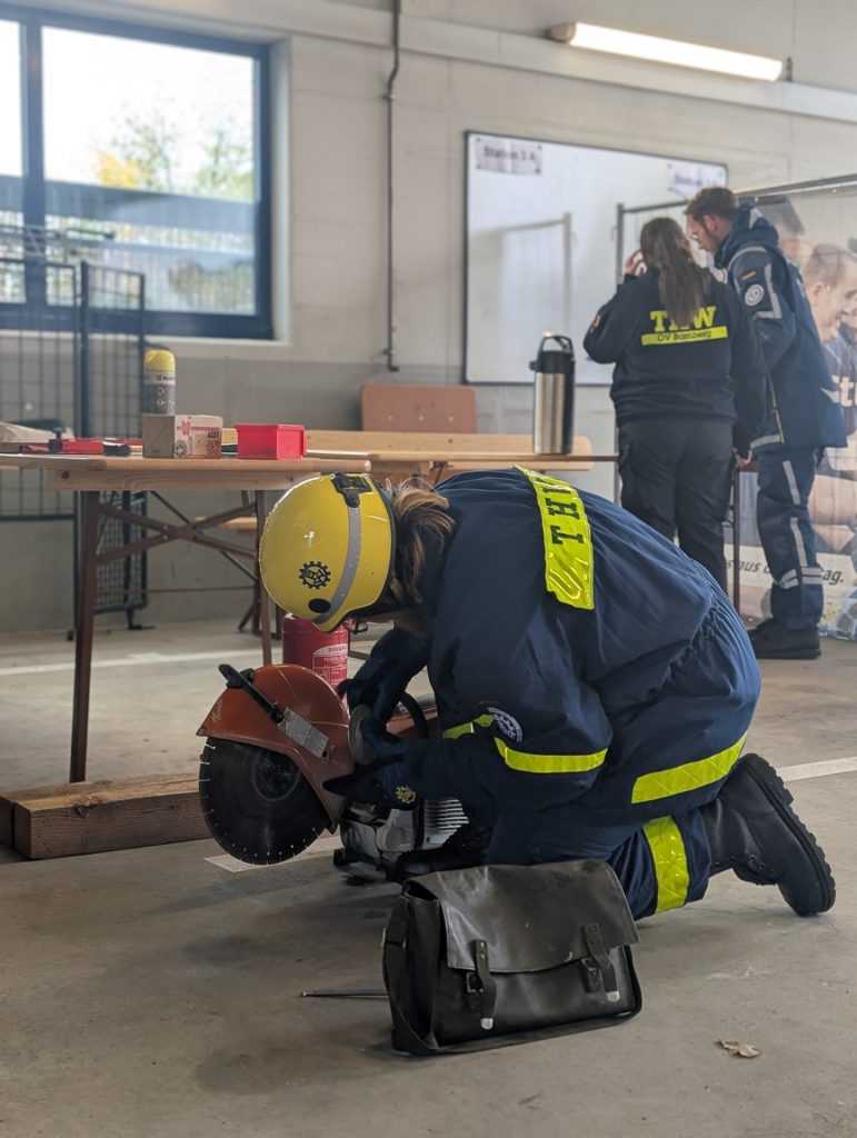 Nach intensiver Vorbereitung legten die angehenden Helferinnen und Helfer erfolgreich ihre Abschlussprüfung ab. Diese bestand aus einem schriftlichen Teil sowie verschiedenen praktischen Aufgaben. Dabei mussten sie unter anderem den sicheren Umgang mit hydraulischem Spreizer und Schere, das richtige Sichern von Verletzten auf einer Krankentrage, den Einsatz eines Trennschleifers sowie das Bedienen eines Stromaggregats unter Beweis stellen – alles grundlegende Fähigkeiten eines THW-Helfers oder einer THW-Helferin.